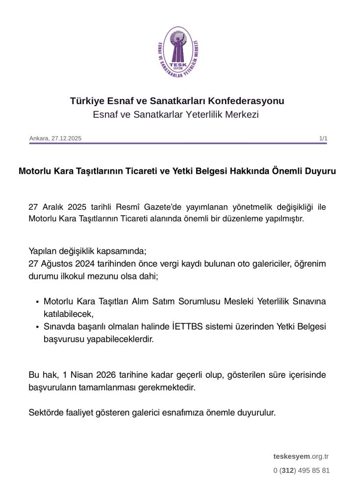 27 Ağustos 2024 ve öncesinde vergi kaydı olan oto galericiler İLKOKUL MEZUNU olsa dahil yetki belgesi başvurusu yapabilecek.